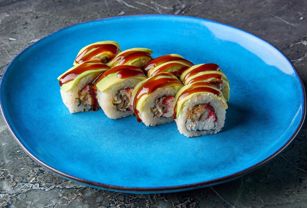 Нори, рис, угорь, творожный сыр, масаго, авокадо, кунжут, соус унаги