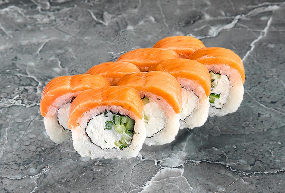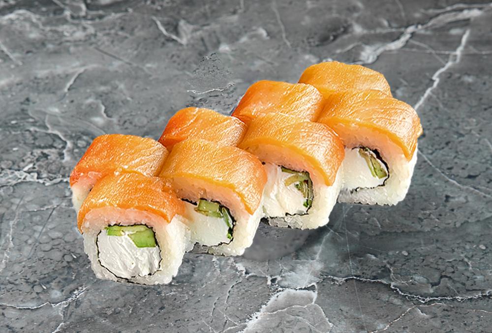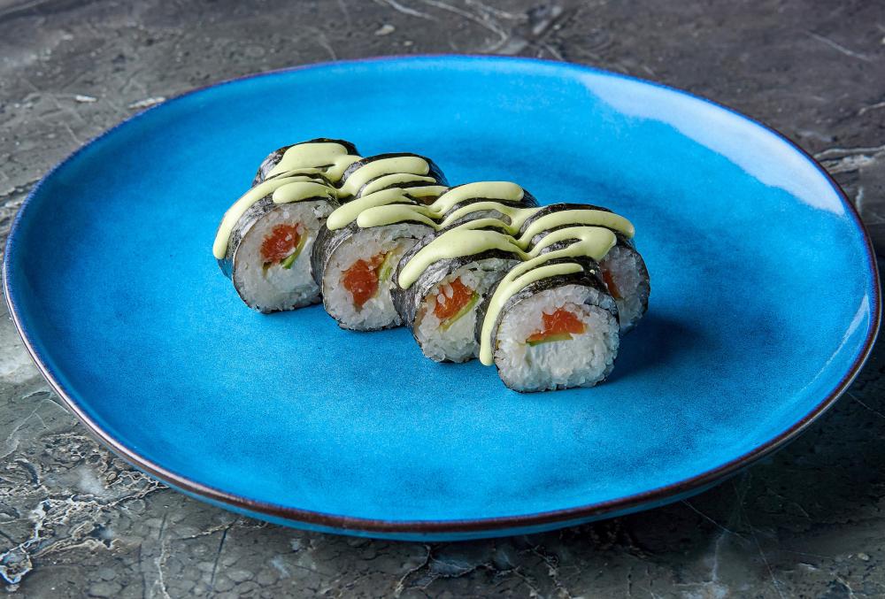 Нори, рис, лосось, творожный сыр, огурец, масаго