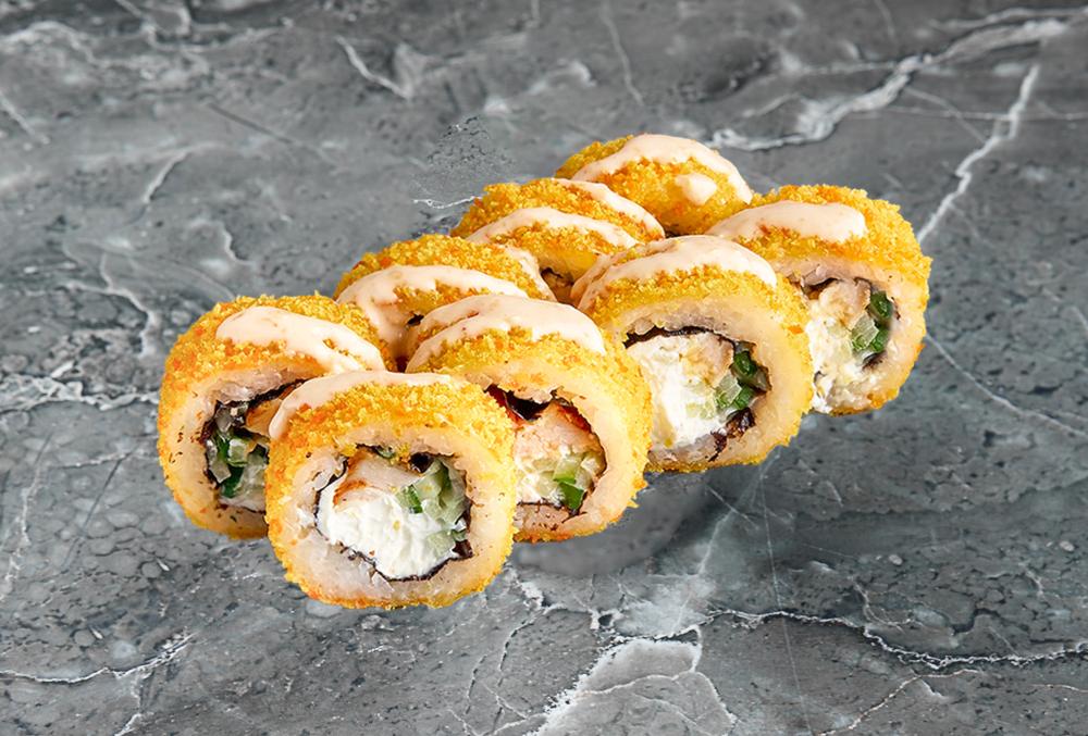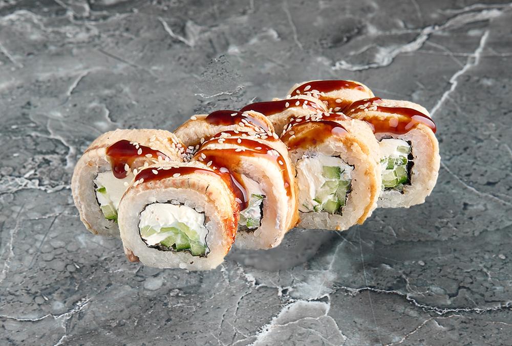 Нори, рис, угорь, творожный сыр, огурец, кляр, соус унаги
