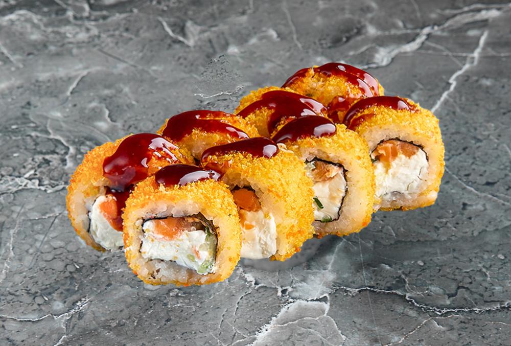 Нори, рис, лосось, творожный сыр, огурец, кляр, соус унаги