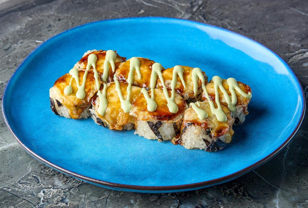 Нори, рис, угорь, творожный сыр, огурец, сырная шапка, соус унаги, соус васаби