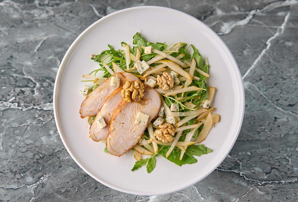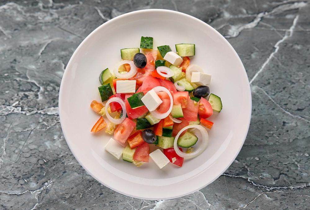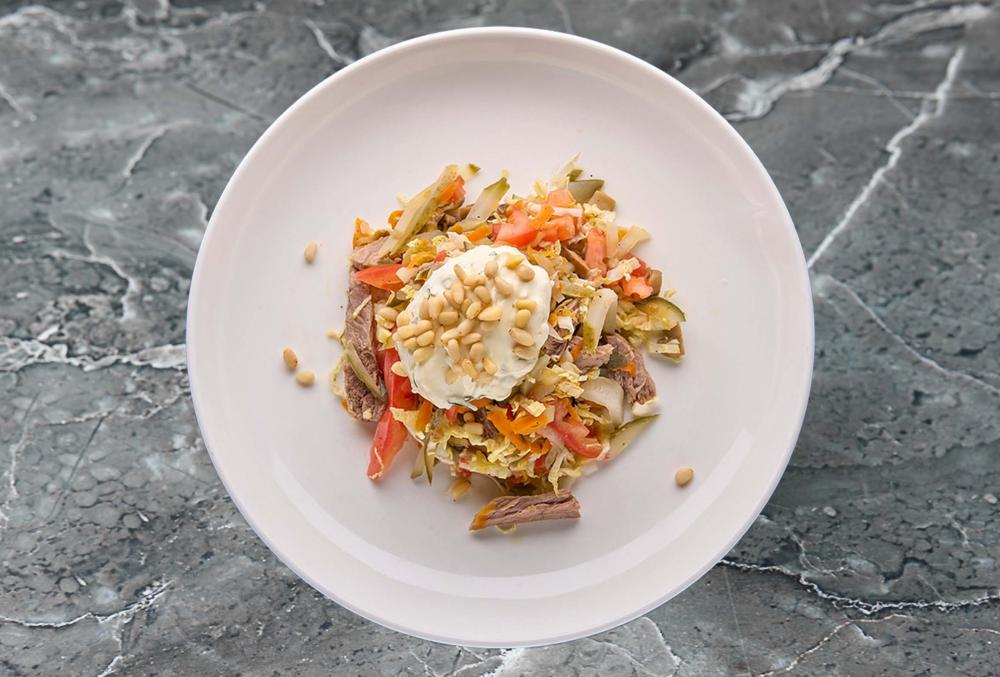 Говядина вареная, огурцы маринованные, пекинская капуста, помидоры, шампиньоны пассированные, соус чесночный, кедровый орех