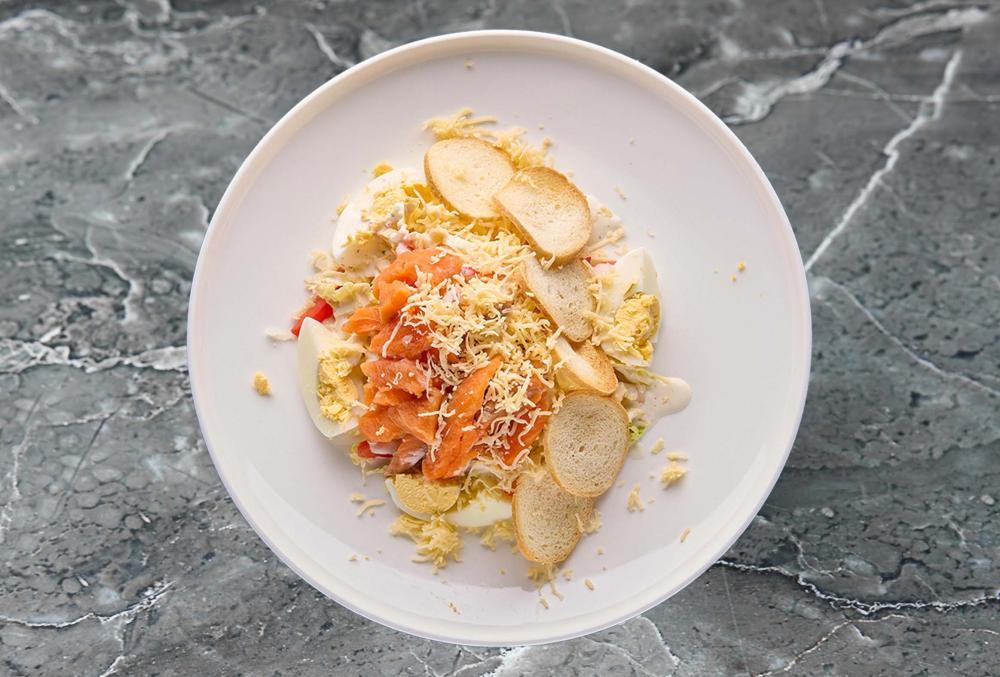 Сёмга с/с, помидоры, пекинская капуста, яйцо, соус Цезарь, пармезан, сухари