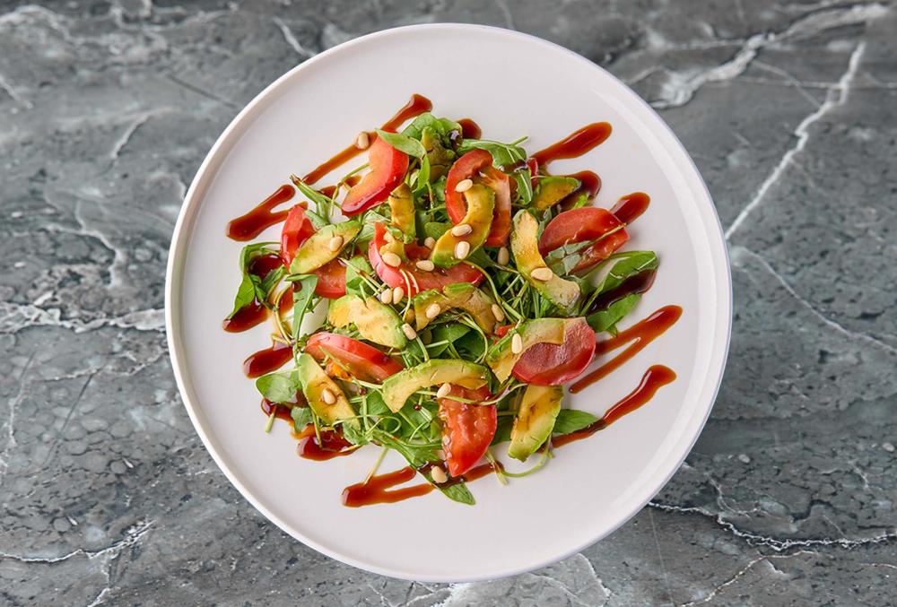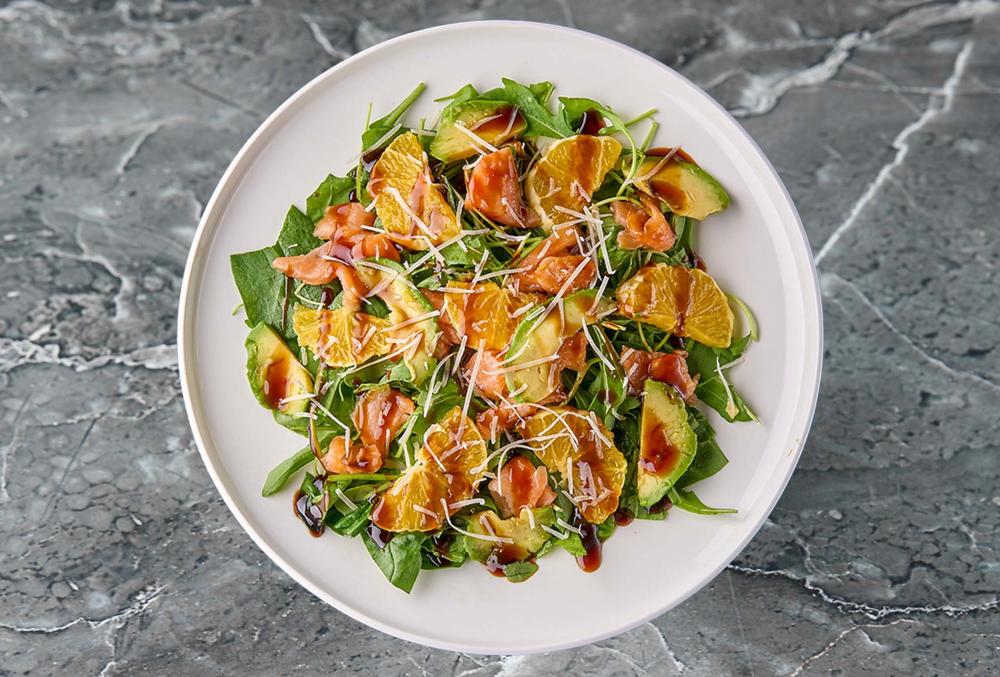 Рукола, шпинат, апельсин, авокадо, лосось,