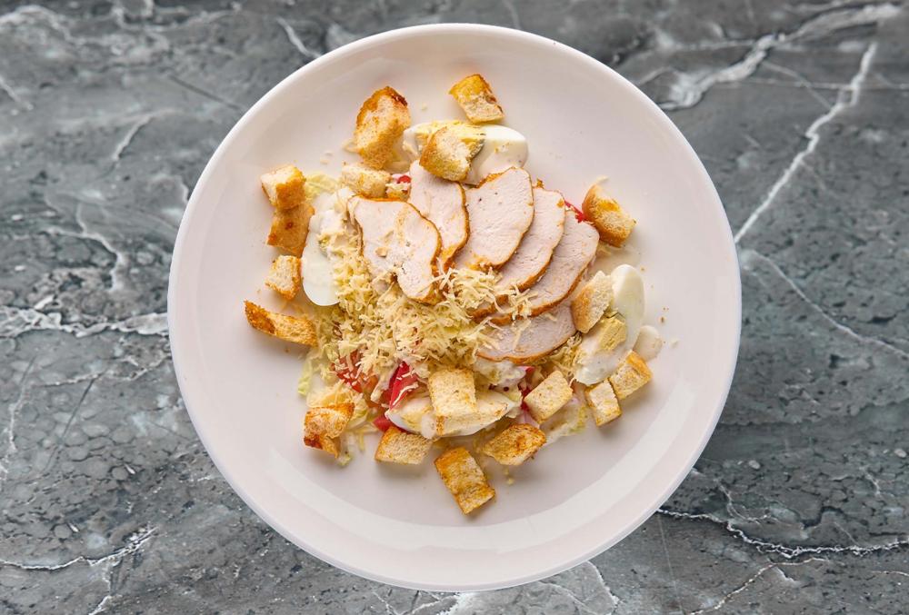 Филе куриное, помидоры, пекинская капуста, яйцо, соус Цезарь, пармезан, сухари